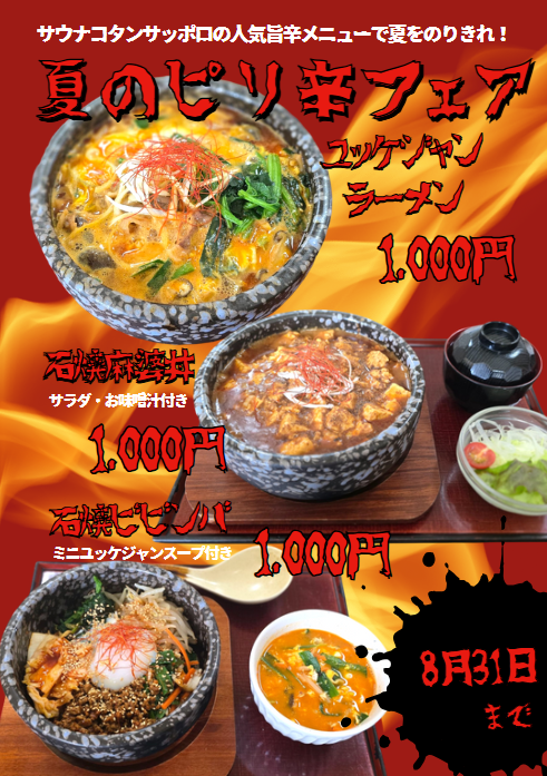 8月31日までの限定で、サウナコタンサッポロの人気メニューであるユッケジャンラーメン、石焼麻婆丼、石焼ビビンバの提供をしております。