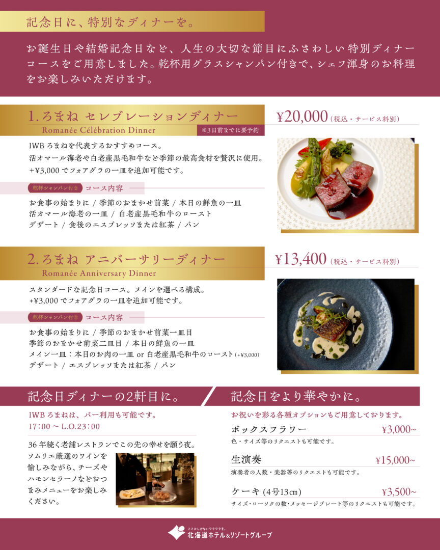 IWBろまねでは、お誕生日や結婚記念日など、大切な日にふさわしい特別なコースをご用意しております。