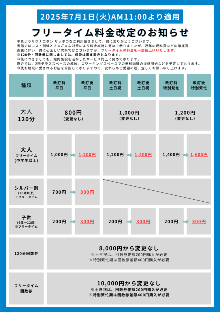 平素よりサウナコタン サッポロをご利用頂きまして、誠にありがとうございます。